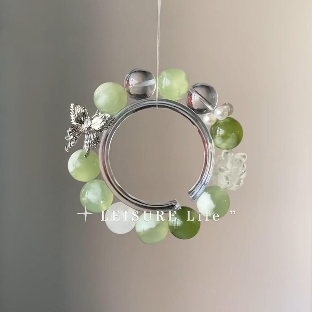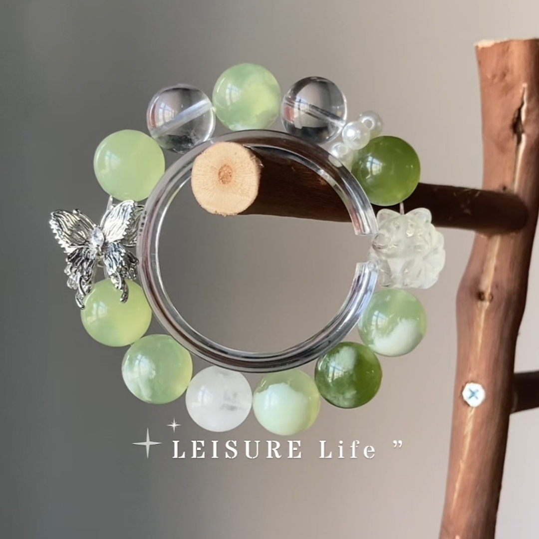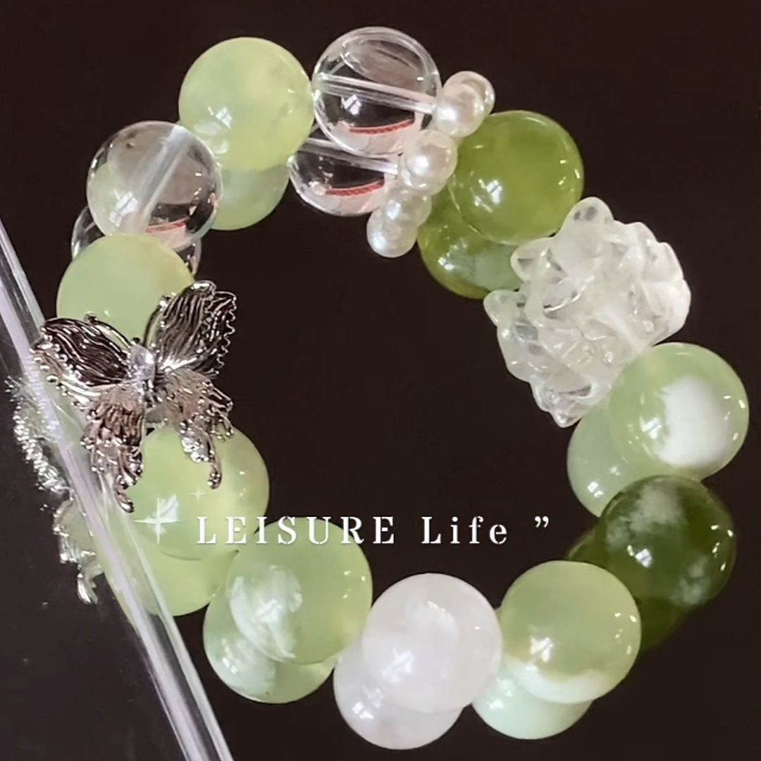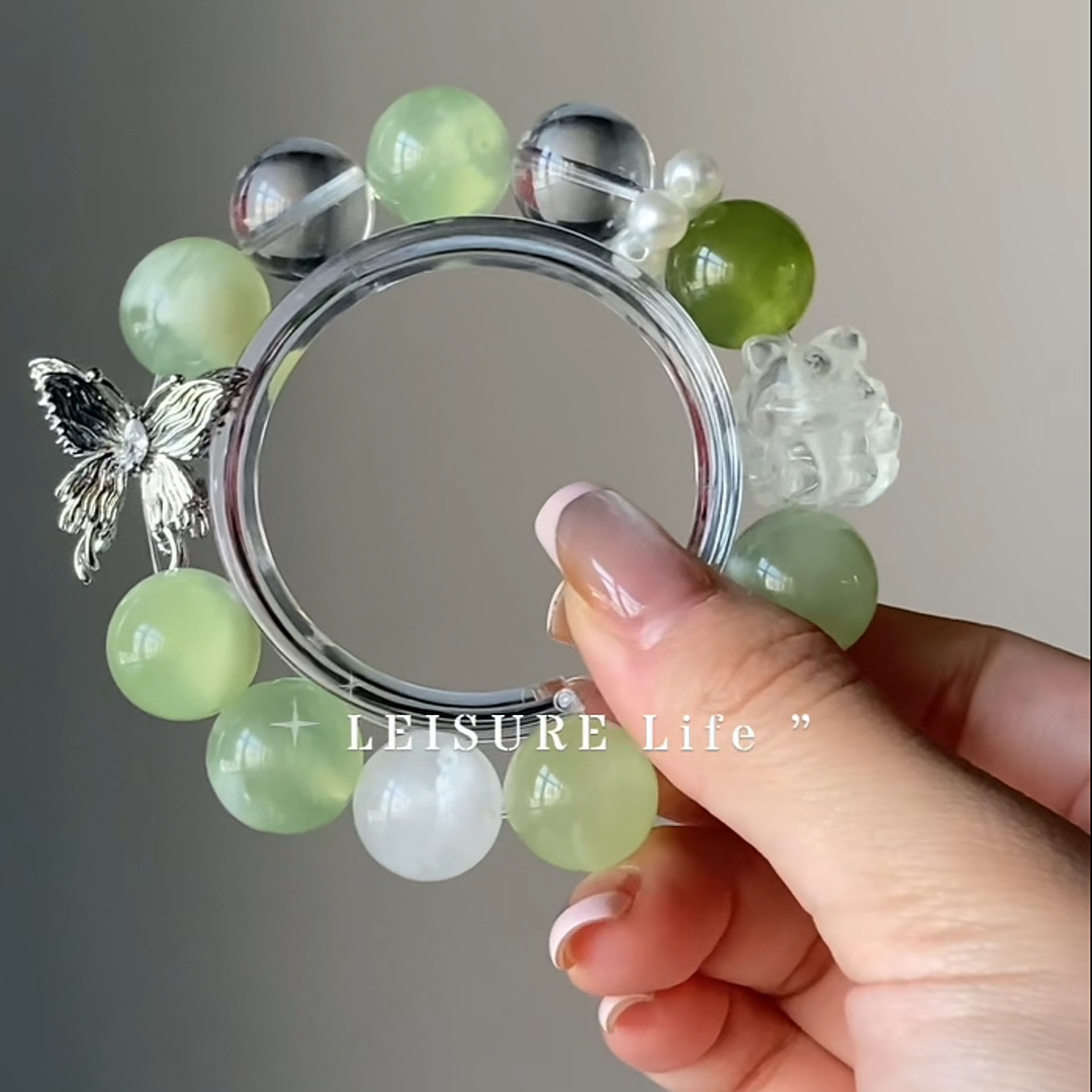 This bracelet was inspired by the delightful aesthetic of a "Green Grape Milk Cap"—a confection of light, creamy sweetness layered over a fresh, translucent green. It’s a study in soft contrasts and joyful harmony. We wanted to capture this essence of "sweet grace" and infuse it with the legendary, clever energy of the Fox spirit.